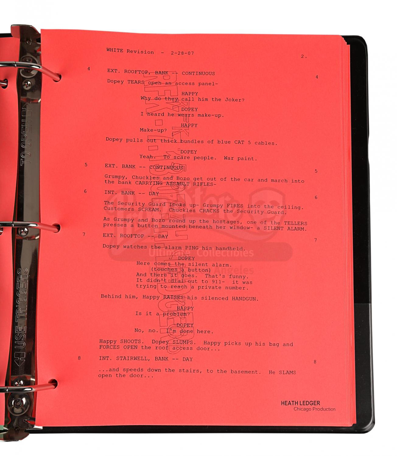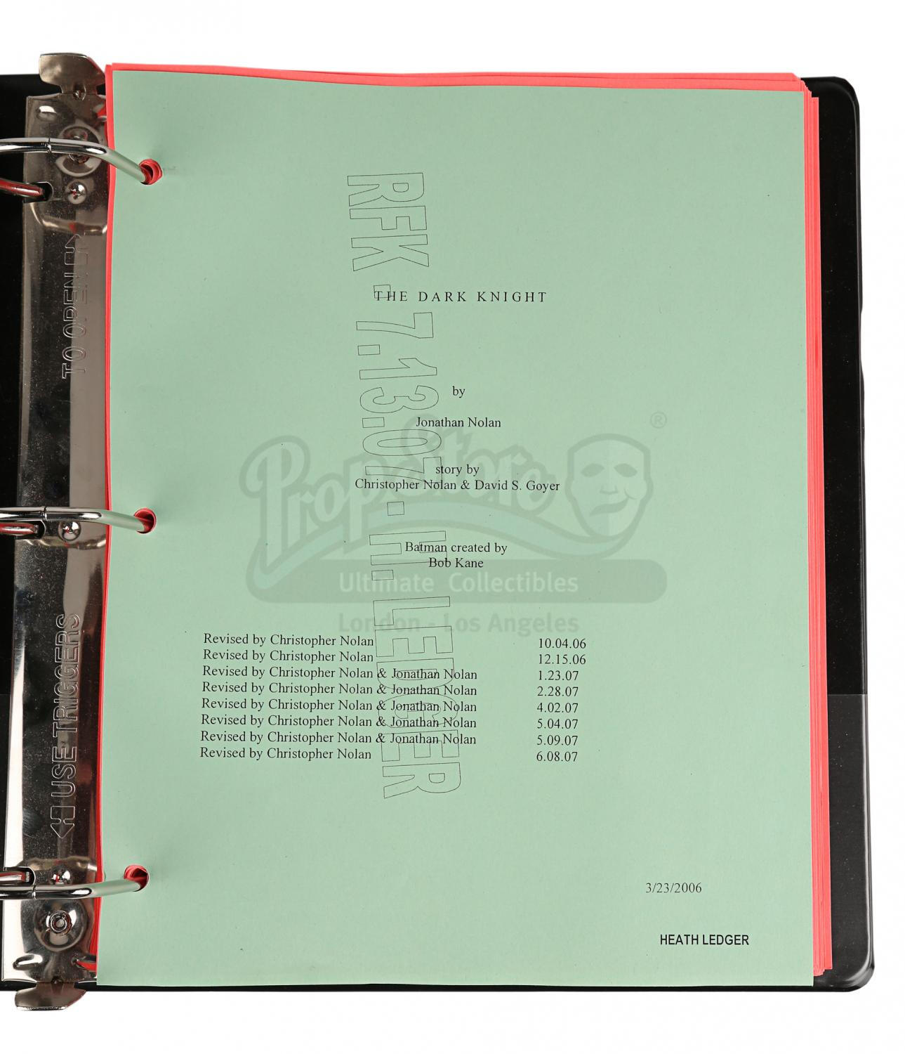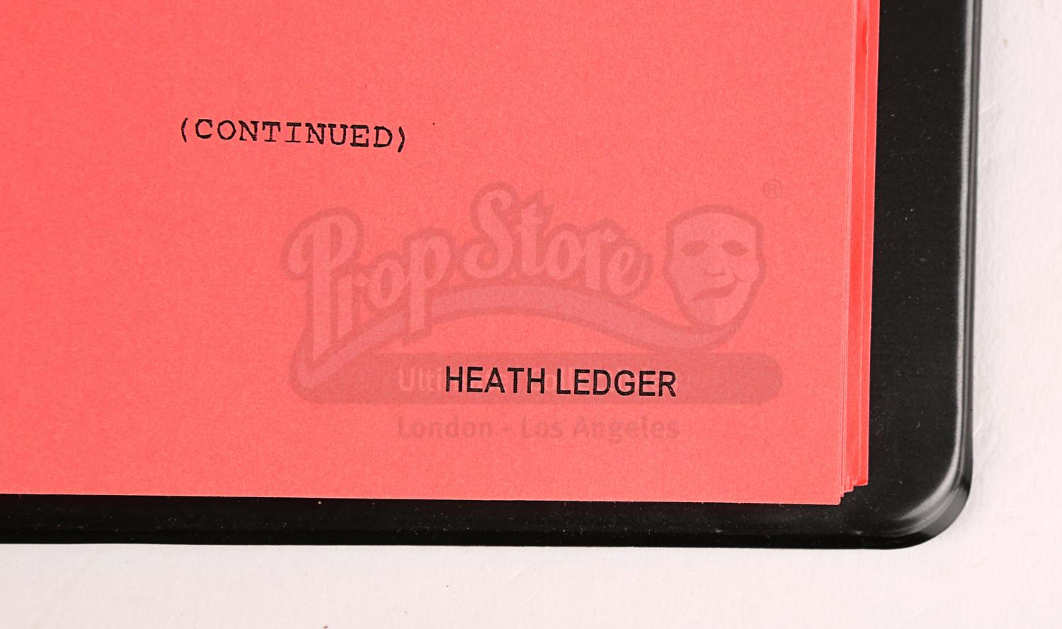 Contained within a black ring binder, the unannotated script comprises 135 pages printed single-sided on bright pink US Letter paper. The green title page features the production title, is dated "3/23/2006" and has a list of revisions and the dates they were added. Each page features a printed watermark and Ledger's name in the bottom right corner. From the personal collection of Heath Ledger's personal assistant who was gifted it by Heath Ledger on the completion of filming.