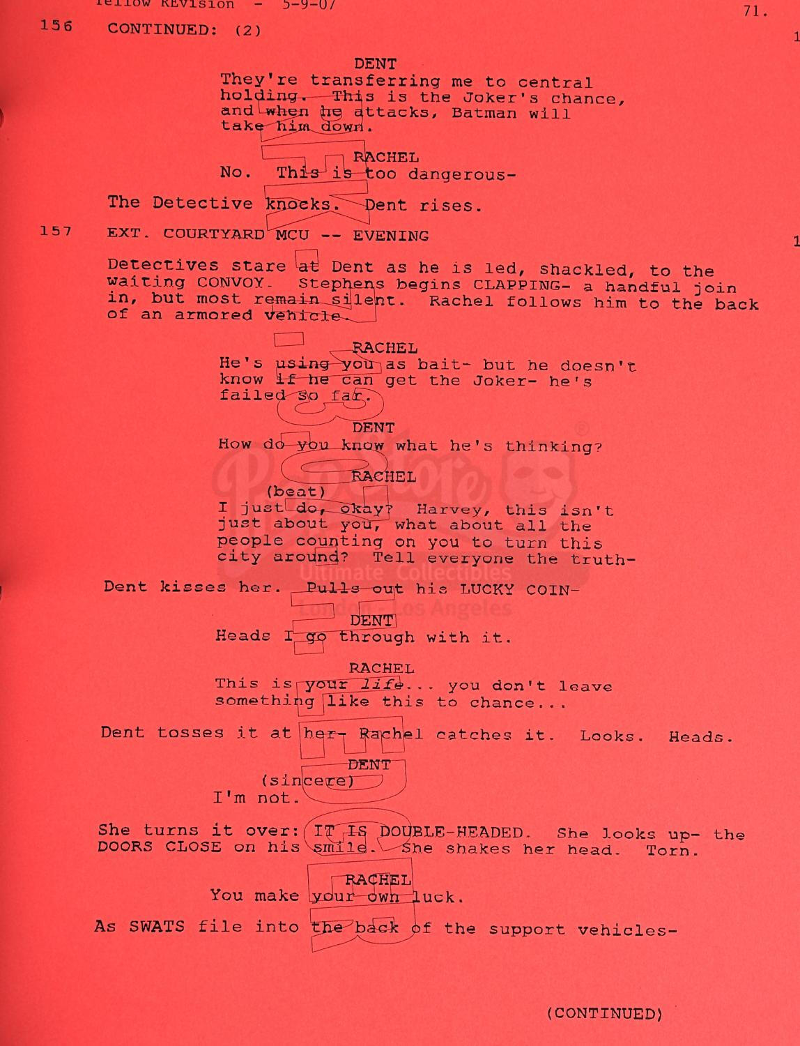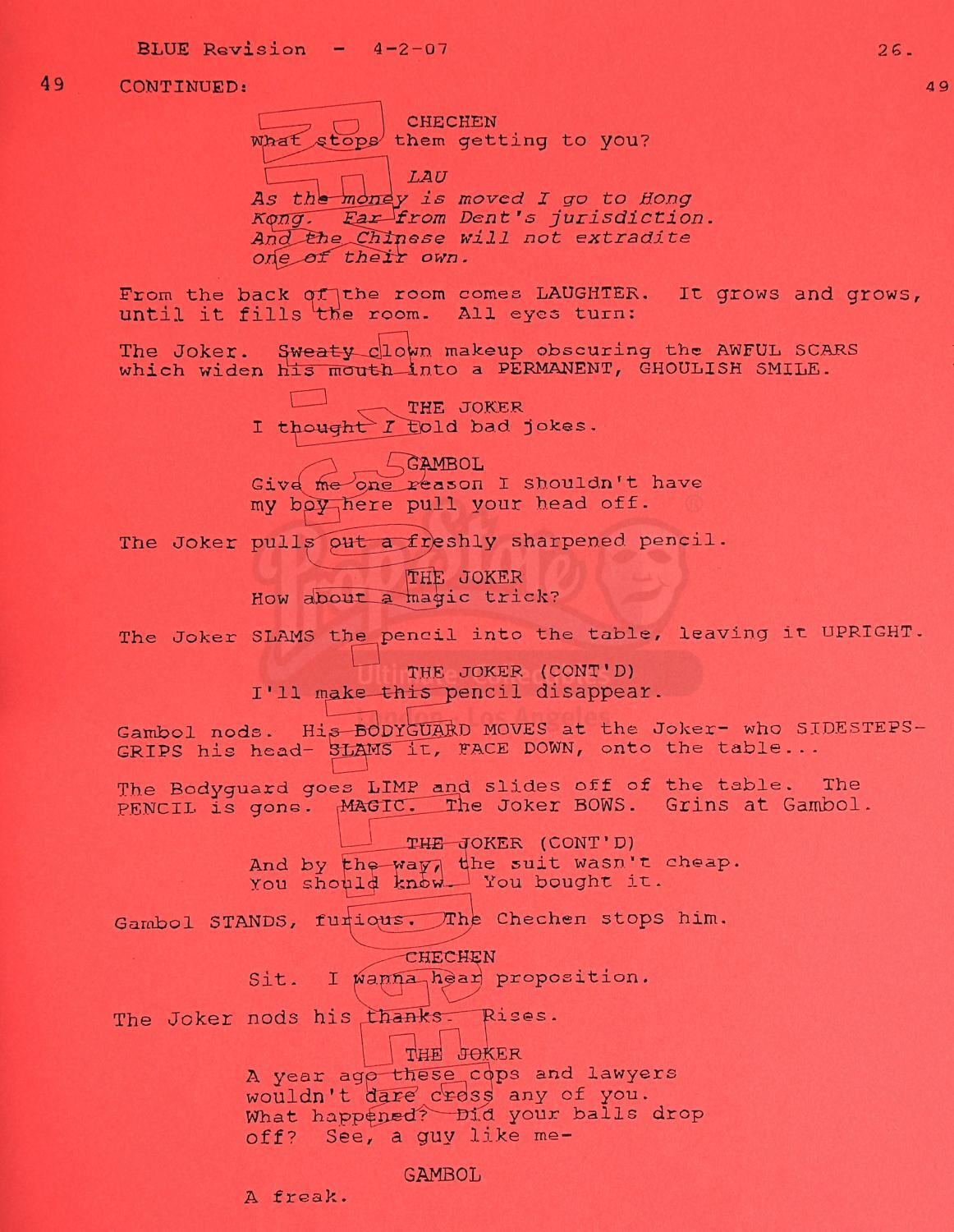 | December 15, 2006 | The Dark Knight script is revised for the second time, and from this point on, revisions will be more frequent, about once a month. In my opinion, this is the version of the script that Heath Ledger will have in hand and begin studying. |