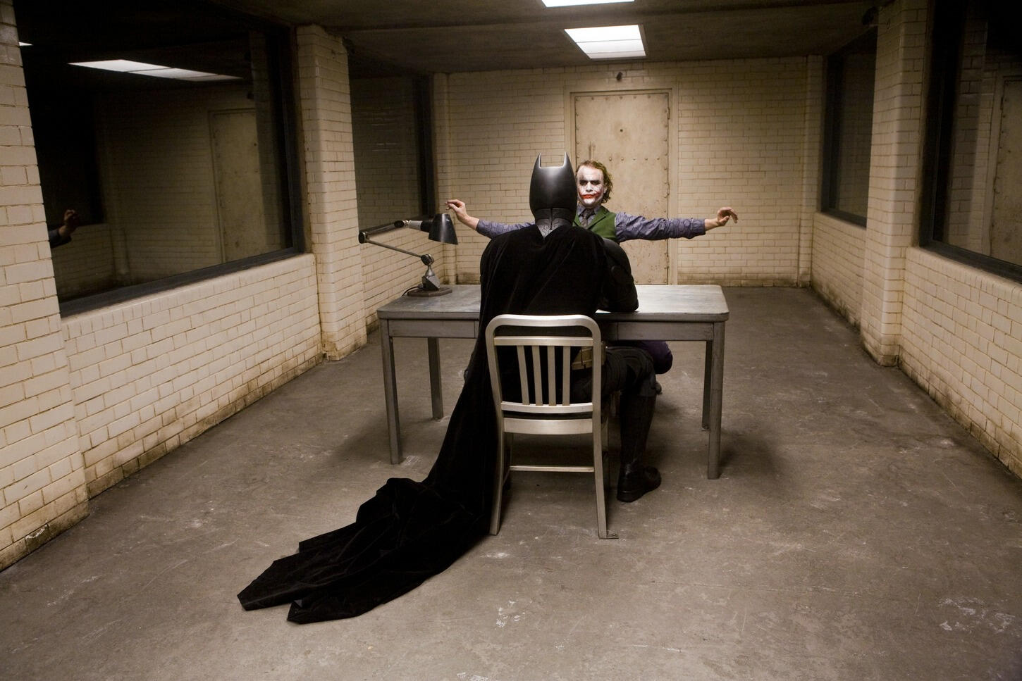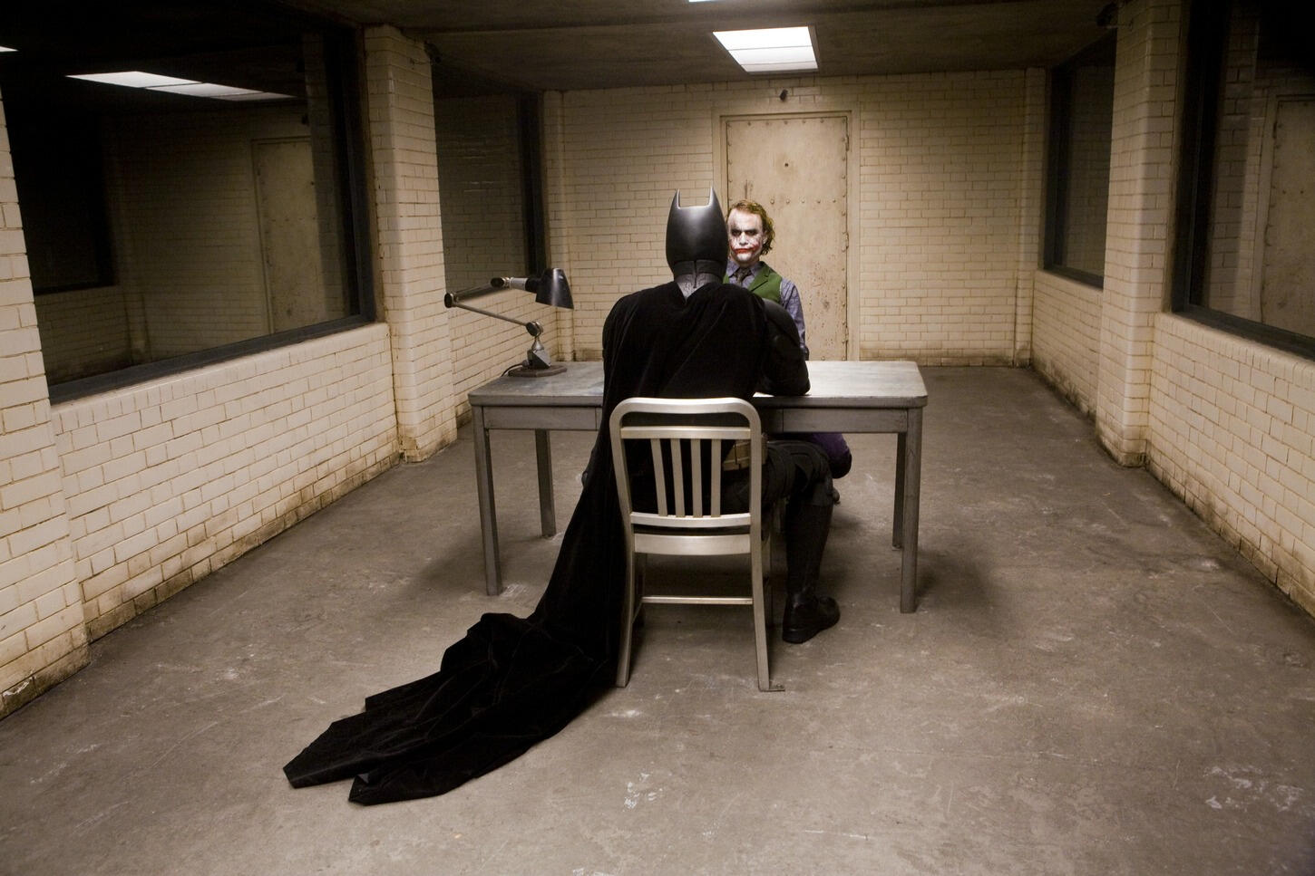 We had a lot of time to shoot it too, because it was so early on. Quite often, as you get behind on other things and you run toward the end of the shoot, things can get very squeezed. But you tend to schedule the first few weeks very generously to give the crew and the actors and myself time to find our feet and find our pace. So we had a couple of days to do it.GB: Can you give me a snapshot memory from those days shooting the scene?Nolan: It was a great set built into a location. It had all of the advantages of feeling that we were in a real place. Nathan Crowley, the production designer, built these great mirrors and this long, tiled room that I really loved the look of; it had the feeling almost of an abattoir or something. That all fed into the brutality of the scene. We wanted to be very edgy, very brutal. We wanted it to be the point at which Batman is truly tested by the Joker and you see that the Joker is truly capable of getting under everybody’s skin. I’m realizing this now about that scene — I haven’t thought this through before — the synthesis of all the different elements that I’m most interested in within filmmaking all come in that scene.