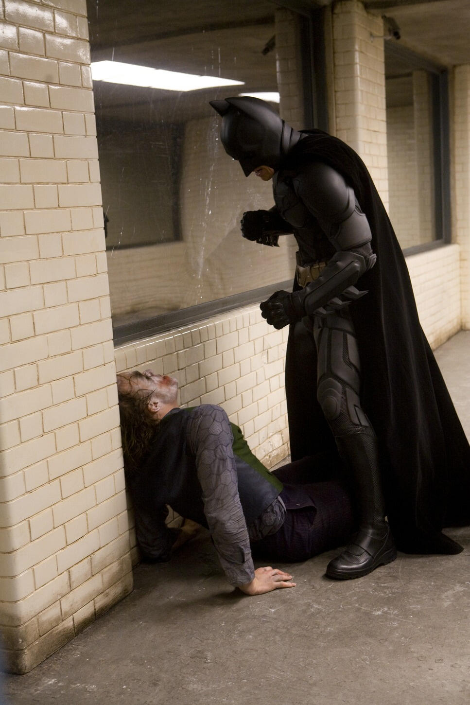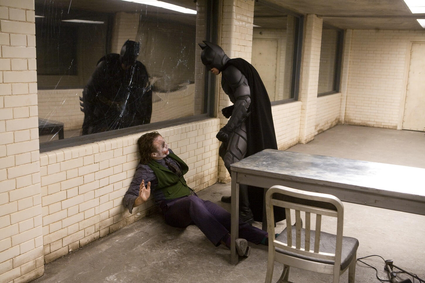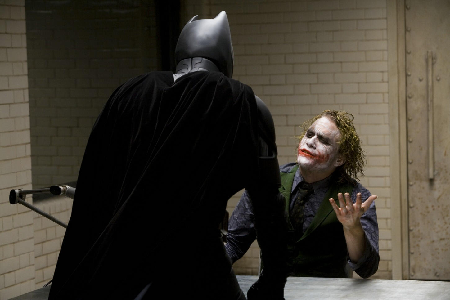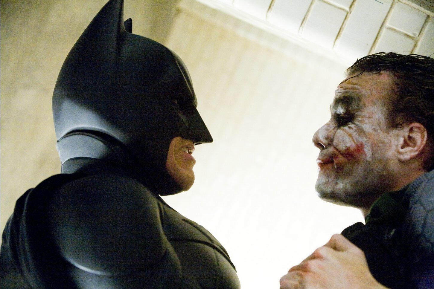 Yeah, another reason we did this scene early on was because the stuff we shoot at the beginning of the schedule, we tend to have more time with. You give yourself more time for it, [but] over several months of shooting a film you get pushed for time. So we gave ourselves a couple of days and split it into sections — quite specifically in the interrogation scene, everything in the dialogue is done with a dolly, and then it goes to handheld. That becomes a different style of shooting. It’s consistent and we want it to be consistent, but you try to break it into those sections because, yeah, once you start really going for it, it’s incredibly draining. [Not just] the physicality, but also the performance — the intensity of the scene, they were just exhausted by the end of it.While Heath’s manipulation of the situation is really fun to watch, what’s also very important in the scene to me is that Christian really wanted to hold on to the idea: at what point would it be too far to go with that character’s approach to justice? What does it mean if he loses control and takes things personally? It’s the sort of thing we toyed around with a bit in Batman Begins, but I didn’t have the story move well enough to push it, in terms of the inner anger of the character. Now we have a scene where you really see him out of control and edgy, while seeing [that despite] all of his strength and all his training…[he] has obvious limitations, and he’s sort of confronted with that.That required a huge amount of energy on Christian’s part. Also, with the punches, I’ve never seen something so beautifully choreographed where every take was usable. You just put a sound effect on it and they all look like a devastating blow. It’s a very intense scene, but there’s no blood in it — partly because of the red makeup and everything, it sort of stands in for the blood, so we were able to make a great PG-13 version of it, but I really felt strongly that it should be an uncomfortable scene. You want to be at this point where you’re really unsure of what you want Batman to be doing.