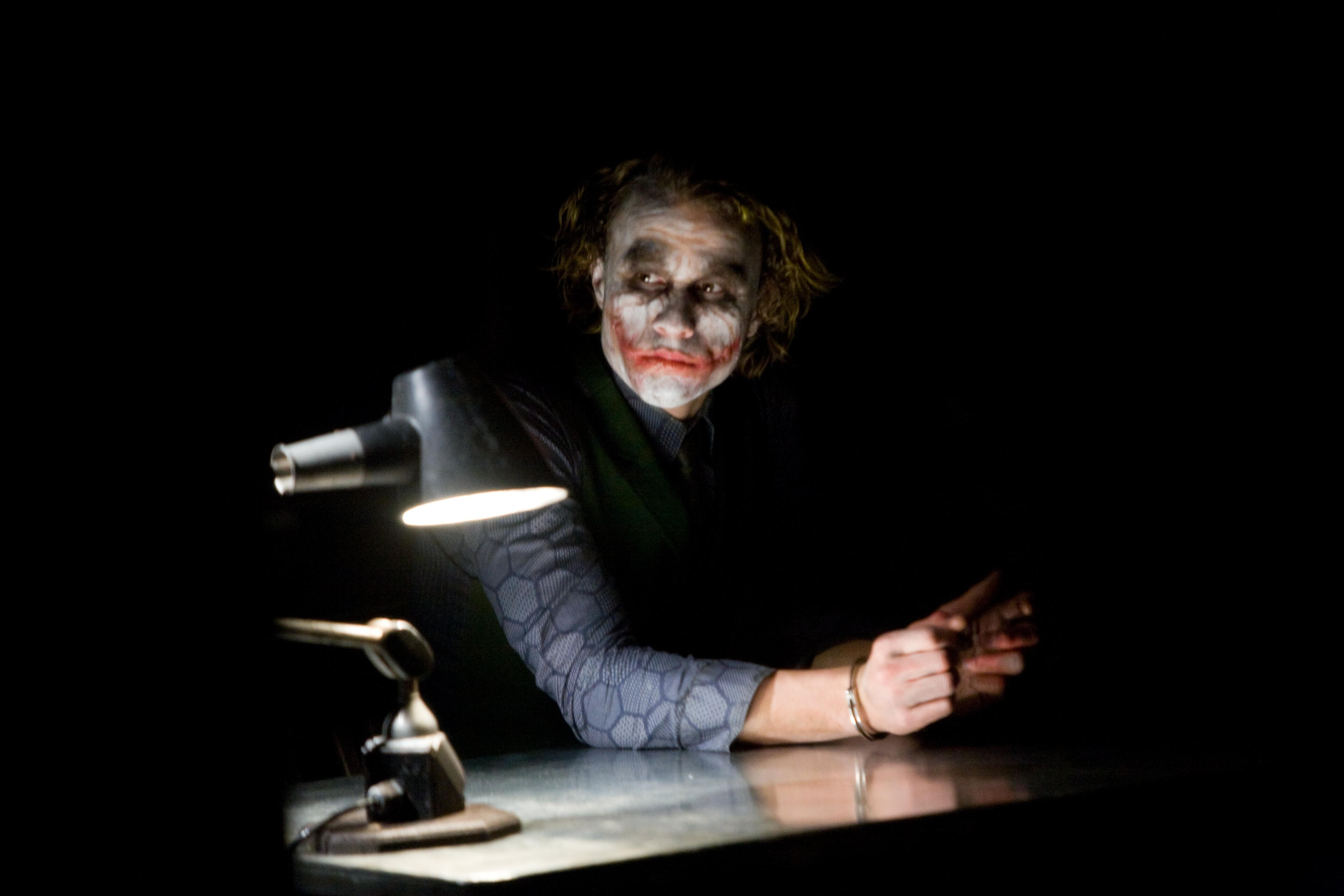 It is. We cast him before the script was even written. Heath spent months and months obsessing about what he would do. I sent him some materials; I had him read A Clockwork Orange — well, I had him go through both the book and the film. I had him look at the works of Frances Bacon, a lot of different tangential things to get into it. Then, once he had the script — which was a very scary moment, when he actually got to read it, because by this time he was so committed and…if he didn’t like it, it would have been extremely difficult — he breathed a sigh of relief, I breathed a sigh of relief. He really felt it hit what we had talked about.So we talked about doing a costume fitting and all this. Like a lot of artists, he would sneak up on something. So he wouldn’t sit there and say, “Okay, now I’m going to be The Joker.” You have to sort of say, “Let’s just read this scene, you don’t have to act it, just read it,” and then he’d read it with Christian and then you’d hear a line or two where he was doing something different with his voice, nothing too intricate. Then we would film hair and makeup tests — we tried different looks with different make up, and that started to move. Then we brought in rubber knives, and he would start to move around and choose what weapon he would have. We would film with handheld cameras so they weren’t so stiff. We would circle around, and he would do his thing and explore his movement. We weren’t recording sound, so he would start talking and showing us what he would do, and that way he sort of sneaked up on it.It was, as with any great performance, showing us something different. The voice certainly frightened me at first because of its weird shift in pitch. What I came to realize [is that] he figured out this whole thing based on the Alexander Technique, which I’m not familiar with, but the principle is if you hit a high note, you’re immediately able to hit the two octaves below — it’s a way of lowering your voice. So we have this character where you never quite know which way the pitch is going to go — just as in his physical movements you just never know how he’s going to move. It’s always a surprise, the actual tone of his voice was always a surprise; sometimes it would go very low and incredibly threatening, and other times it would be almost like a sing-song, almost light in a way.The first time I really saw it all together was in the interrogation scene. That was first scene we shot with The Joker because I wanted to make him really commit to something up front. Well, the first sequence we actually shot was the IMAX prologue, which was the bank robbery, where he has the mask on. I just really wanted him to enjoy that and not worry about too much. You see his character in that scene is like Buster Keaton or like Chaplin, it’s just a magical character through every gesture; I just loved what he did there. Then there is the moment where he pulls his mask off, which was tremendous, but it was the first time we shot with the IMAX camera, and when we looked at the dailies it was all a bit out of focus. So I rescheduled it, and I got this horrified phone call from him saying, “What have I done wrong?” This was the first time he really showed us the voice and what he was going to do, and we want to re-shoot it. I told him no, it was great, but I don’t think he ever quite believed me, actually.He re-shot it very graciously because he was a tremendous professional, but in the end we actually used the out-of-focus one because it was magic, it just had that little thing. The first thing we really did shoot on the real schedule though was the interrogation scene, and we took our time shooting it and he was very grateful. We shot it in England with this very gruff British crew. They had all worked with Jack Nicholson and thought, He’s the only Joker. They didn’t quote know who this guy was and what he was doing, [but] afterwards they all looked at him differently…it was a great thing for him.When you’re doing a scene like that, it starts with dialogue and then moves into physical action — does that change the way you approach it with the actors in terms of the number of takes you do or the amount of rehearsal at full blast, as it were, due to the physical exhaustion factor in tandem with what they have to do emotionally?